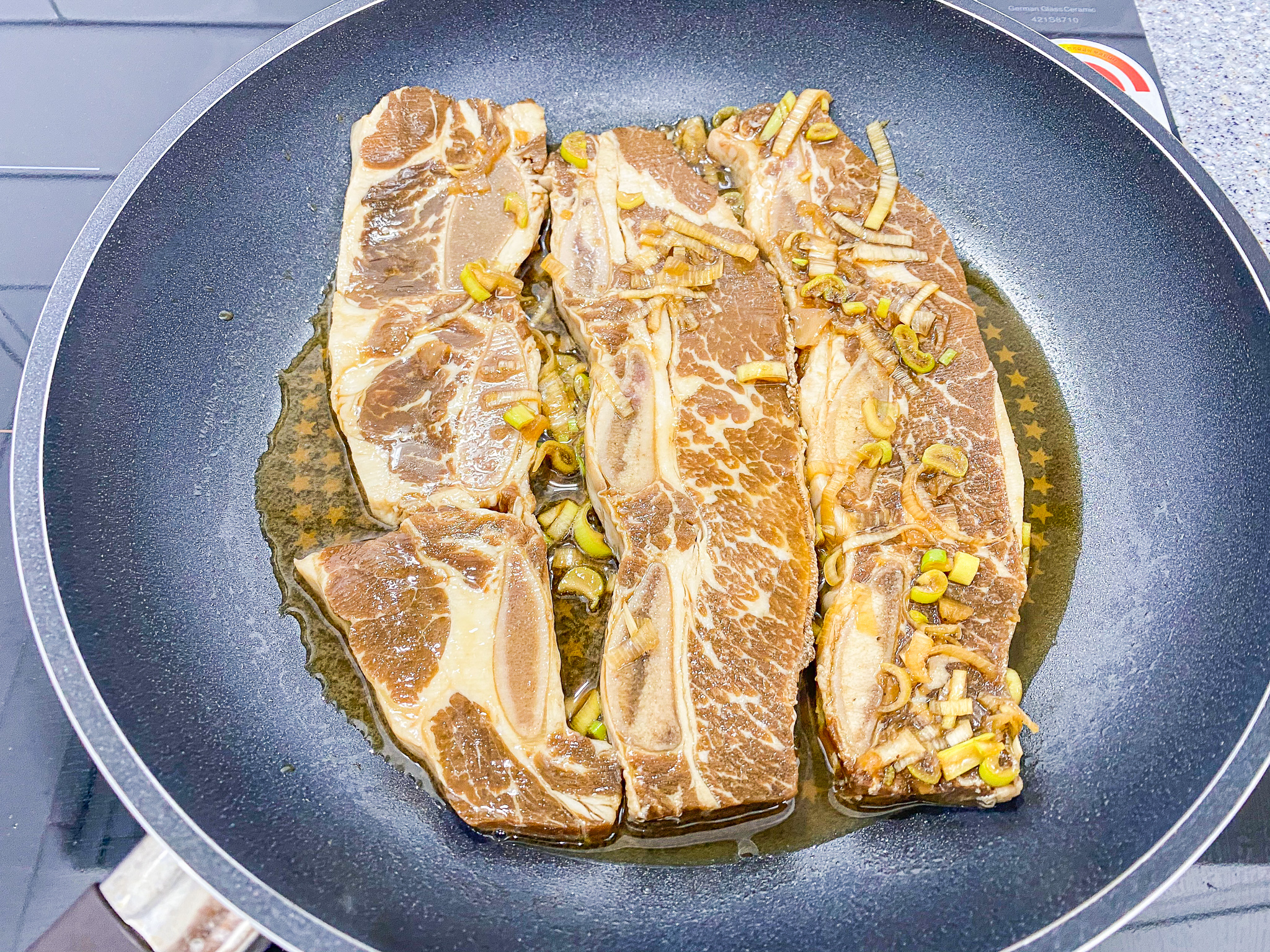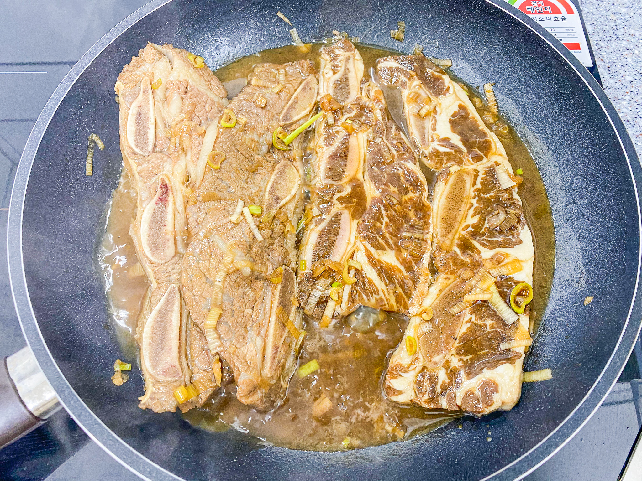 이제 잘 숙성시켜준 고기를 구워주는 일만 남았겠죠? 달구어진 프라이팬에 고기와 함께 양념을 조금 넣어줍니다. LA갈비구이 만드는 법의 핵심은 바로 조리듯이 구워주는 것인데요. 그렇게 구워야 맛있는 갈비를 먹을 수 있습니다. 저는 파도 함께 졸여먹기 위해 일부러 넉넉히 양념통에서 덜어주었습니다.