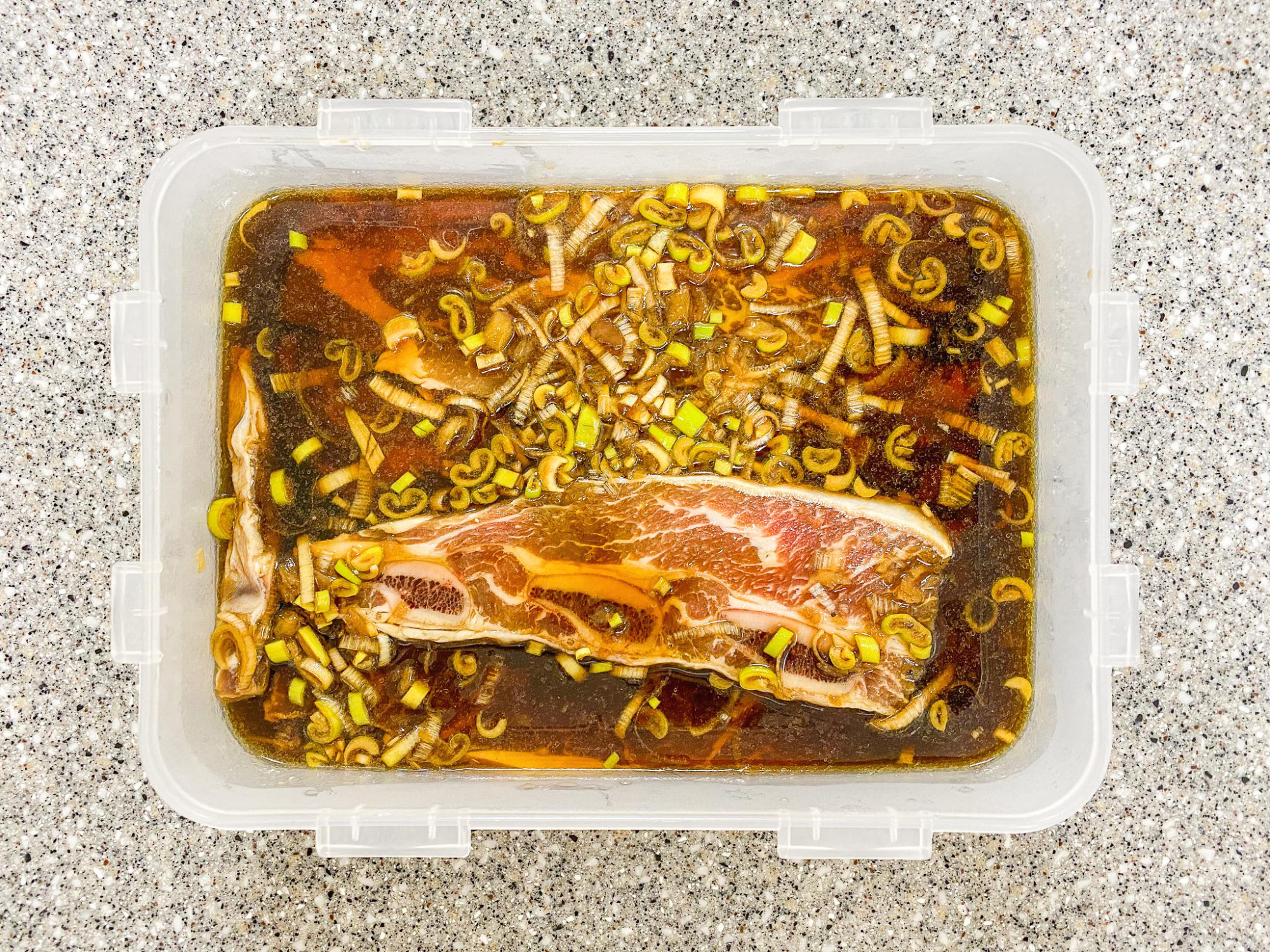 양념 재료: 진간장 140g, 황설탕 56g, 맛술 70g, 간 마늘 28g, 대파 56g, 참기름 10g, 정수물 378g, 후춧가루 소량