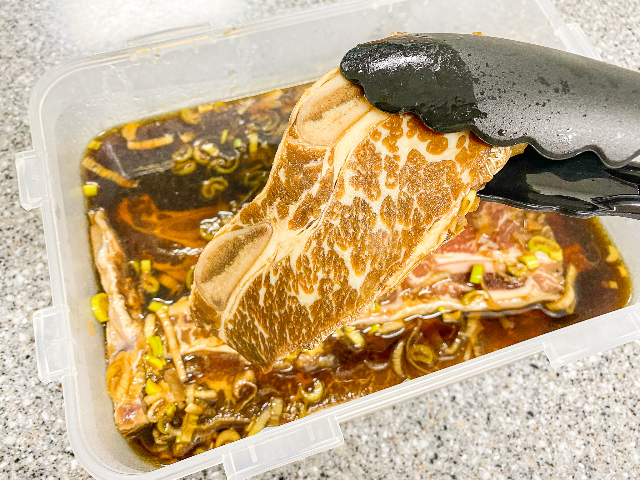 하루가 지난 LA갈비는 이렇게 갈색깔이 은은하게 돌게 됩니다. 원하신다면 2~3일까지 숙성을 하셔도 되고, 길게 숙성하면 할수록 고기에 깊이 양념이 스며들어 더 어두운 색깔을 띠게 됩니다.