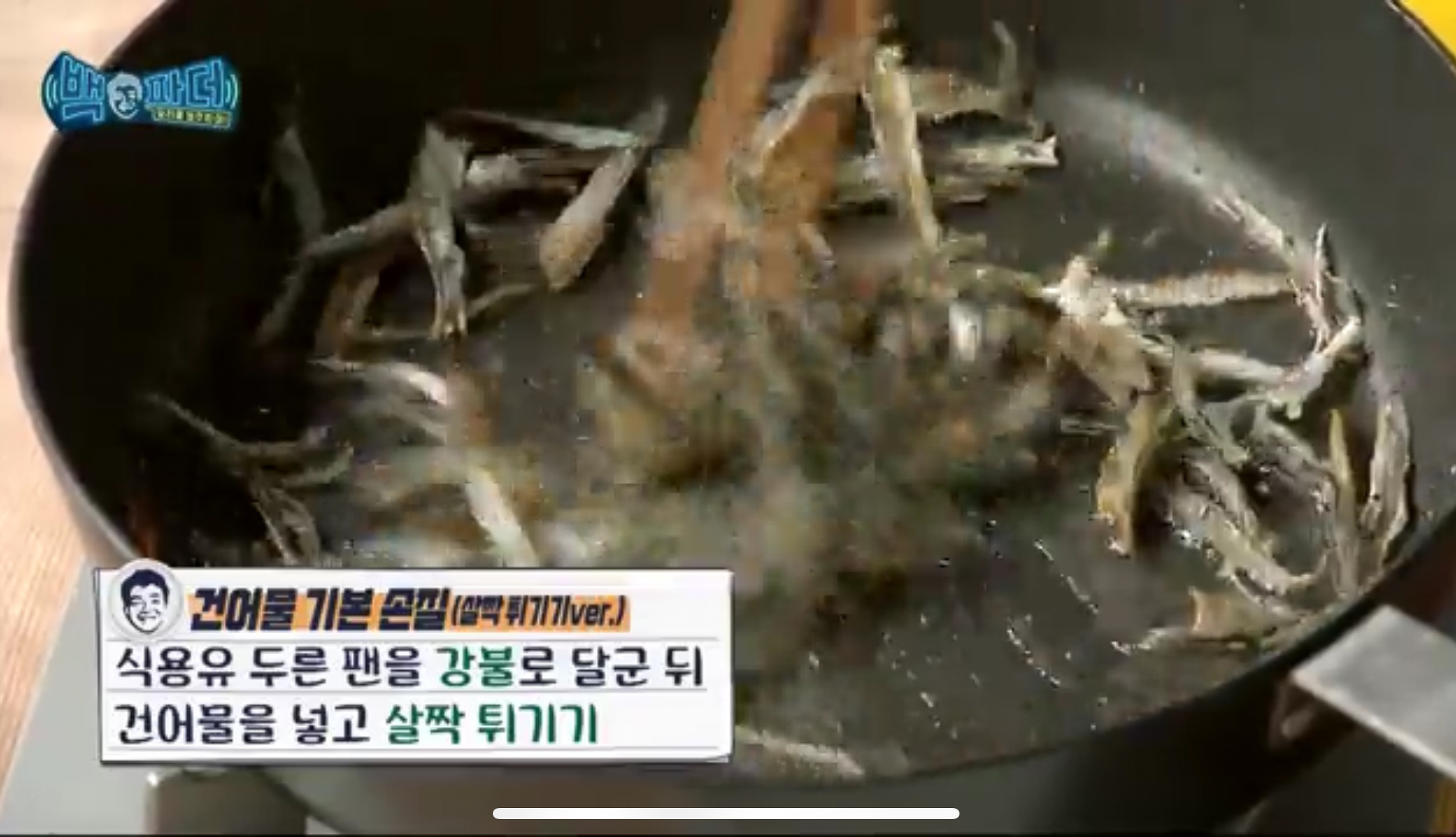 팬에 기름 5큰술을 넣고 기름을 달구어 튀기듯이 볶아줍니다. 가장 비린내가 많이 날 것 같은 재료 순으로 볶아주면 되는데요. 가장 먼저 국거리용 멸치를 볶아주면 된답니다. 30초를 천천히 기다렸다가 접시에 덜어주세요